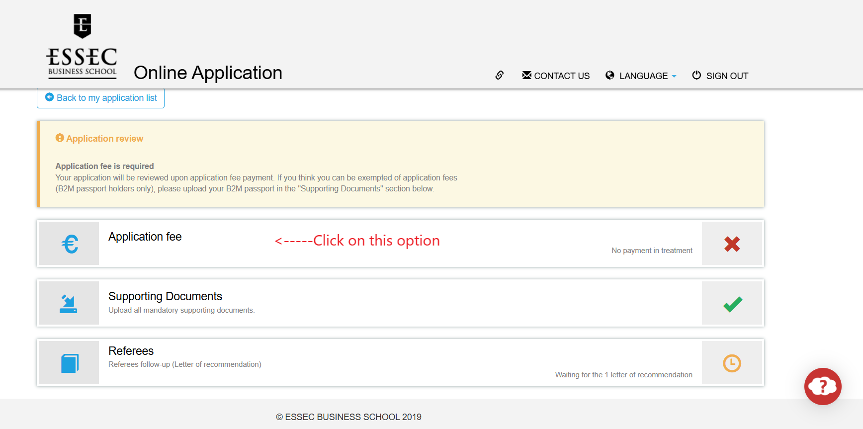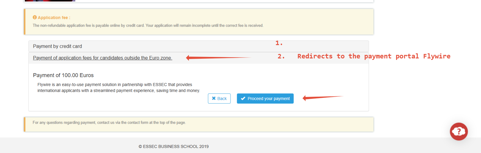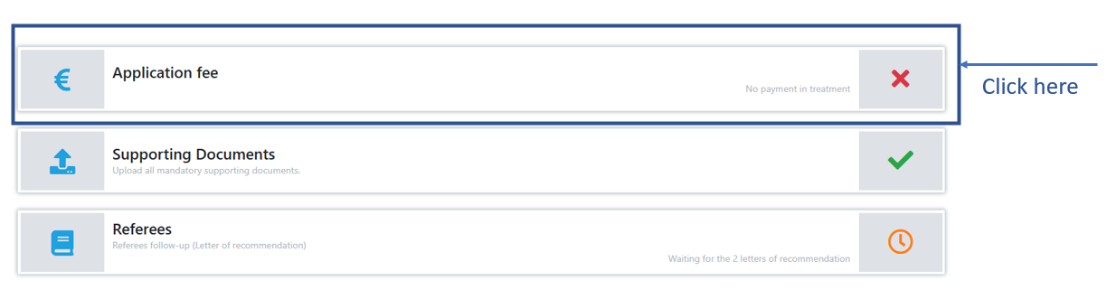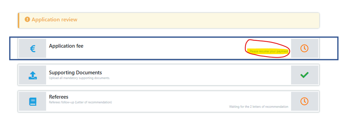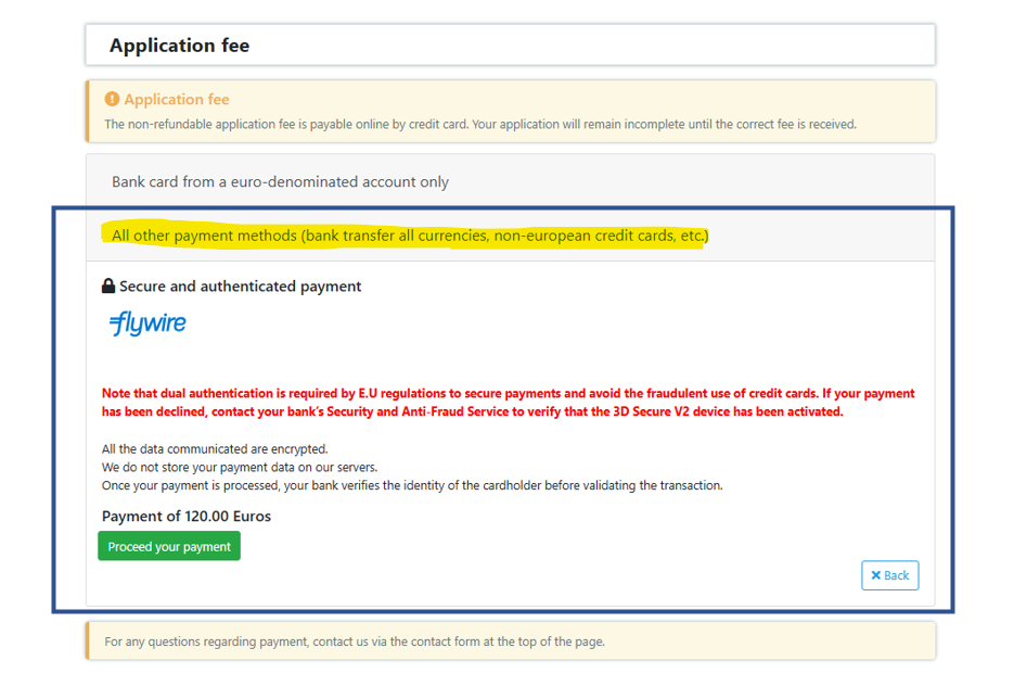 Depending on the country of residence, it is also important to note that sometimes a mode of payment may not work, the transaction is cancelled or may take some time to reach us. In this case, in order to avoid any inconvenience/delay, it is advisable to send a message through the “contact us” button available within your online application portal.