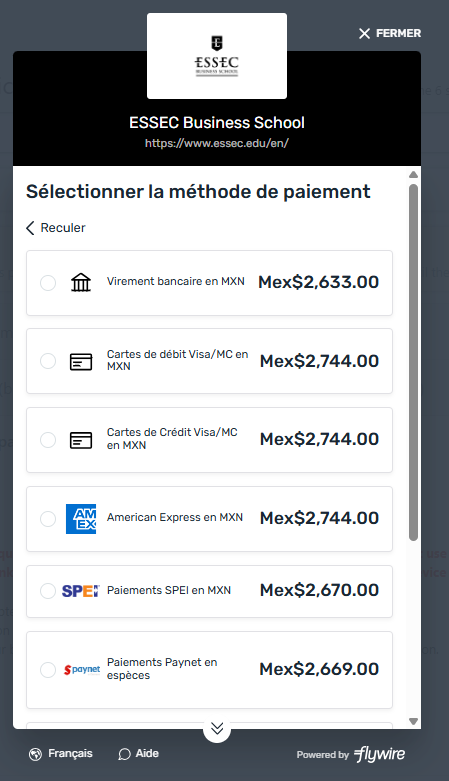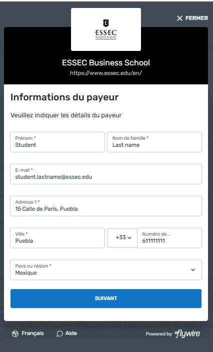 Once you click on “proceed your payment”, you will have a pop up window in which you’ll complete the following information and choose your preferred payment method. You’ll be able to follow-up directly in the dedicated flywire dashboard. The delay might depend on the method chosen.
