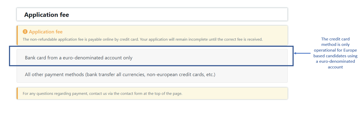 Thus, if you are a candidate based in Europe using a euro-denominated account, you will be able to use the “bank card” option as indicated in the screenshot below: