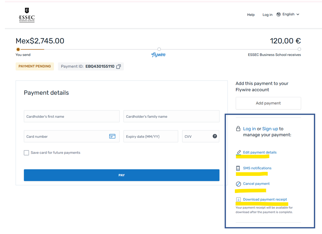 You will be redirected to the flywire dashboard in which you can complete your payment, edit payment details, manage sms notifications, or cancel your payment in order to choose a different payment option within flywire. This is shown in the following screenshot: